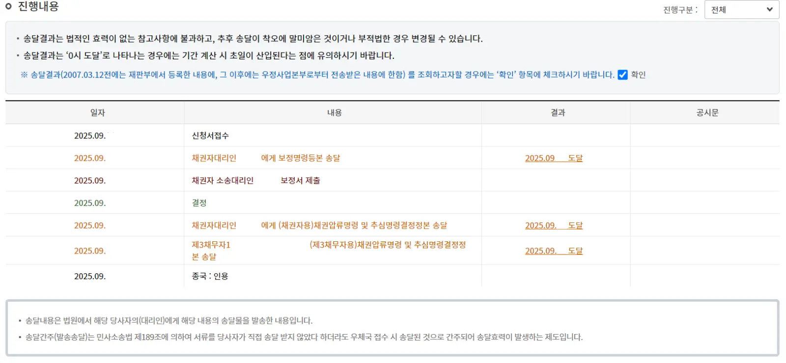 법원에서 조회한 사건 진행내용입니다.