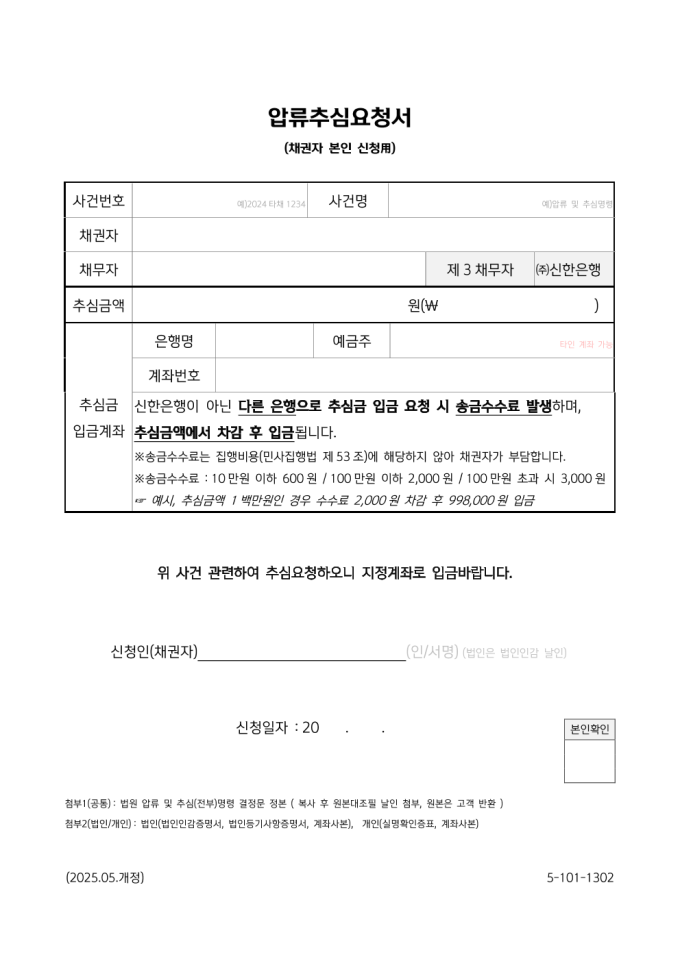 추심금 지금 신청서 예시 (신한은행)